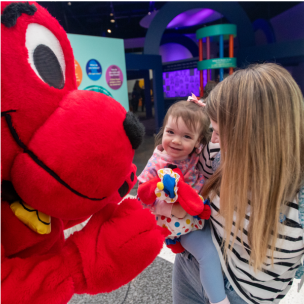 Which day was the best? If you measure by attendance, the biggest day was March 13th, which welcomed 8,000 visitors to appearances by Bluey and a Free Family Night underwritten by ExxonMobil. In terms of Houston traditions, CMH's Pi Day celebration on March 14th featured one of the longest-running annual Pi(e) fights in the nation, sponsored by ConocoPhillips. The event with the most heartfelt moments may have been the Clifford day on March 11th. Pictured below, a mother and daughter meet Clifford, and they have even brought with them the Clifford stuffed animal from when mom was little.